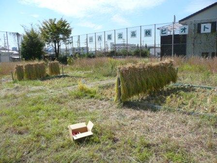 10月12日の「ビオトープで学ぼう」の授業で農林22号を、10月13日の体験交流会でヒノヒカリを刈り取り、10日間ほど天日干しをして、