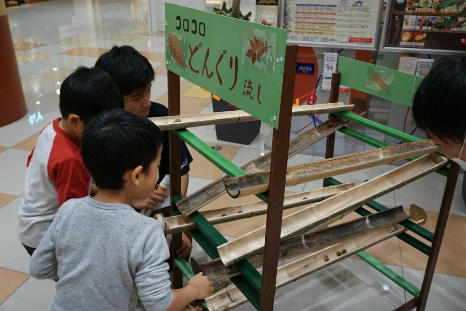 メイン企画である「みんなでつくろう!いきものマップ」では、虫、鳥、植物など近所で見つけたものを付箋に書いてもらって、マップにたくさん貼ってもらいました。普段自分たちが見かけている八尾のいきもの以外にも、「ここに○○がいたんだ!」という新たな発見もありました。「コロコロどんぐり流し」では小さな子どもたちがどんぐりを転がし競い合っていました。さらには何度も挑戦する子どももおり、その場はまさに「パラダイス」でした。