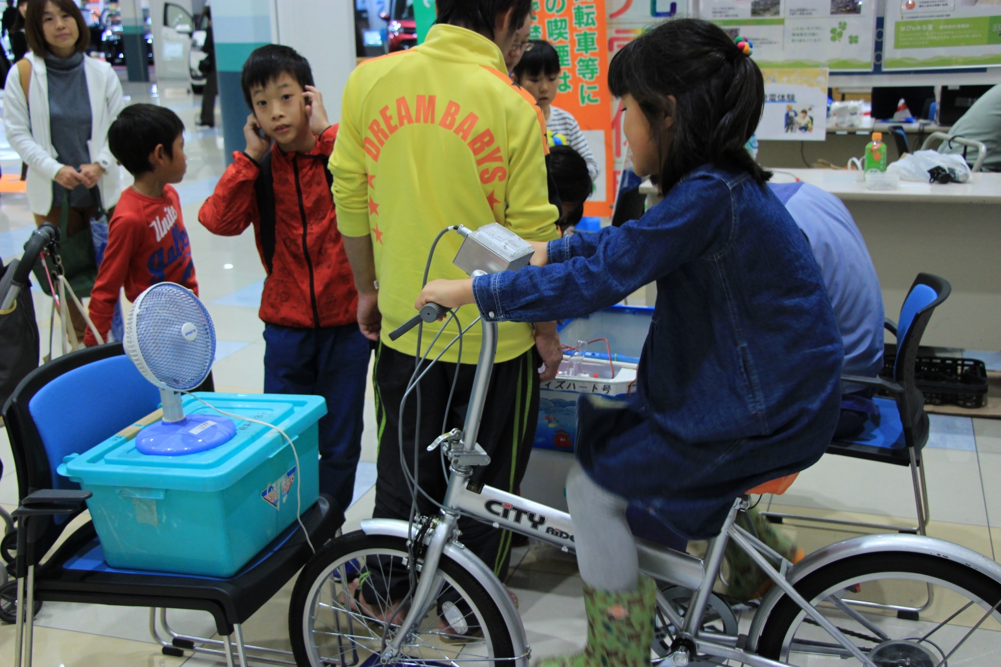 ブルーコート2階奥は、エネルギーに関するエリアで、エコドライブシミュレーターを使ったエコドライブ体験、天然ガスに関するタッチパネルクイズ、自転車をこいで電球を発電する自転車発電体験など、見たり、体を動かして体験できる企画がたくさんあります!