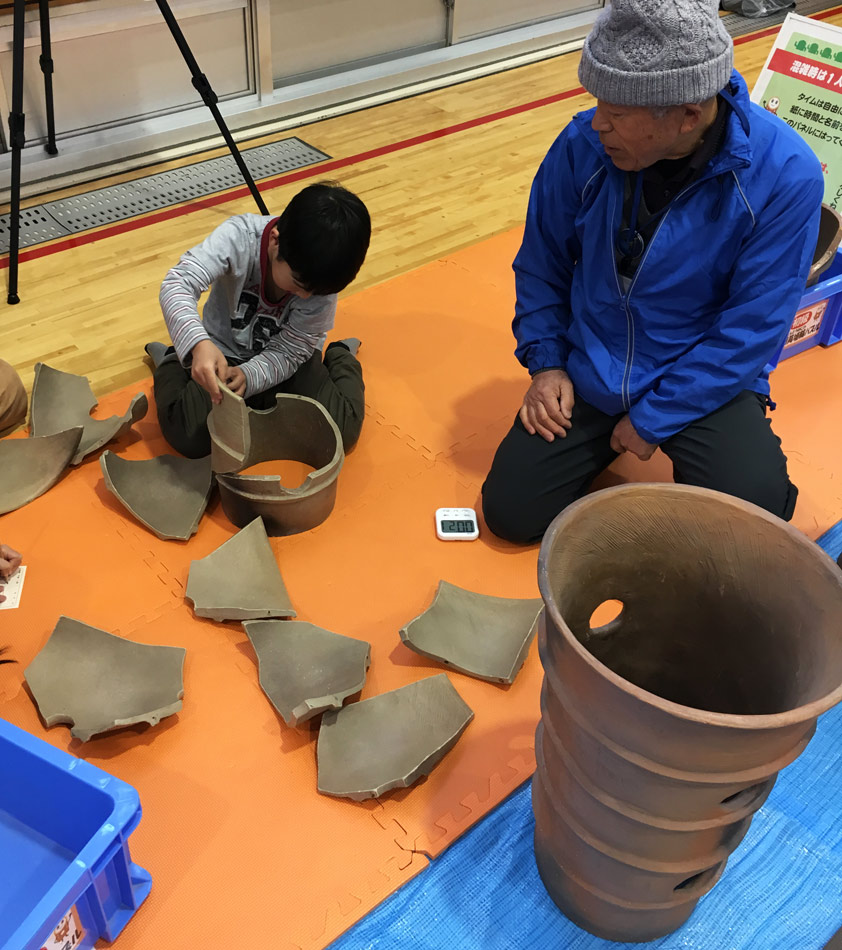 埴輪の破片の中に磁石が入っているので、正しくつなぎ合わせると、バッチっとくっつきます!