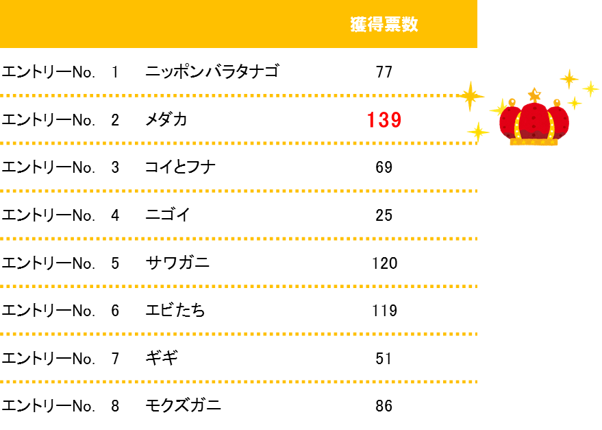 さすが、メダカ!!堂々の1位ですね!!