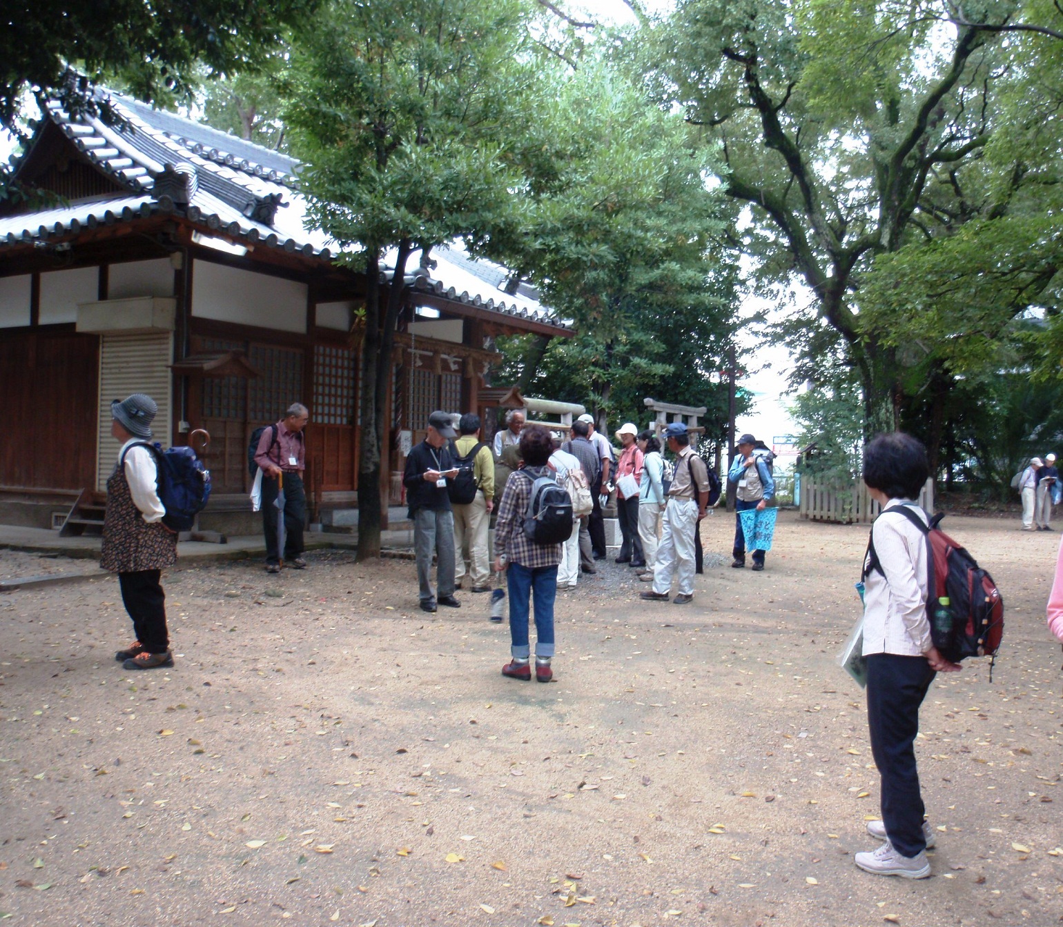 当日、穏やかな天気に恵まれ41名の参加者が集いました。八尾市には、石器時代から様々な埋蔵遺跡や文化財が、各地区から発掘されていますが、周知の通り由義宮に関する遺跡は、現在のところ幻となっております。八世紀半ば過ぎに造営されたとなっている由義宮ですが、772年に河内方面に大型台風が襲い、大和川が氾濫し志紀・弓削地域一帯も瓦礫の山となったと続日本記に記載されています。当時、河内・八尾地域において称徳天皇と道鏡とによって造営された一大モニュメントであった由義宮は、それによって跡形もなく歴史上から消しさられてしまったことは誠に残念です。ただ、この付近に今も都塚の地名を残し、都留美島神社や由義神社が後世になって建立されたことで、その痕跡を少し伺い知ることができます。